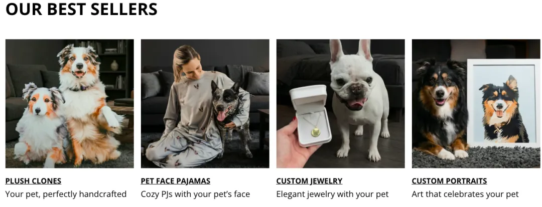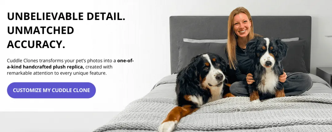 Cuddle Clones的独立站大量使用了原物与克隆物对比的真实返图,视觉冲击力极强。给用户的感觉是:我们我们能做得和爱宠原来的样子一模一样。