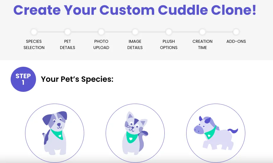 在设计定制页面时,提供给用户的不是简单的表单,而是一个带有视觉指引的交互沟通:选择品种、选择姿势(坐着、站着、趴着)、上传照片,每一步都有明确的模板和指示。这样能大幅减少用户的决策疑虑。