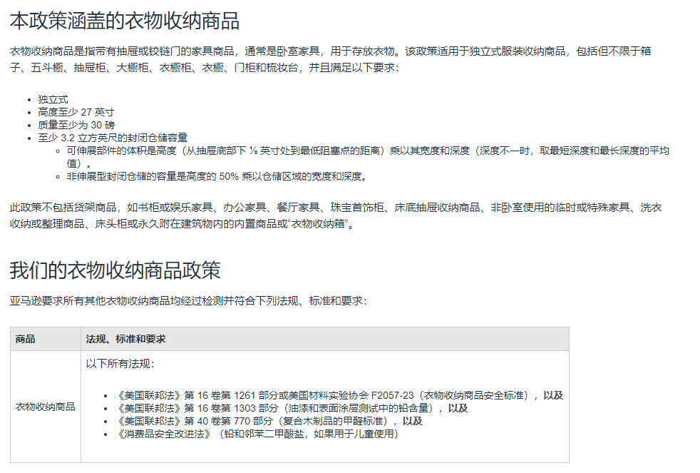 家具倾倒是一个严重的安全问题, 家具倾倒事故导致了数百人死亡和成千上万的受伤。2023 年2月1日, 美国消费者协会(CPSC)在 16 CFR 1261法规强制要求服装储存单元需通过ASTM F2057-23标准, 标准从2023年9月1日起生效, 要求家具制造商确保抽屉和衣橱等高家具在使用过程中不会倾倒。