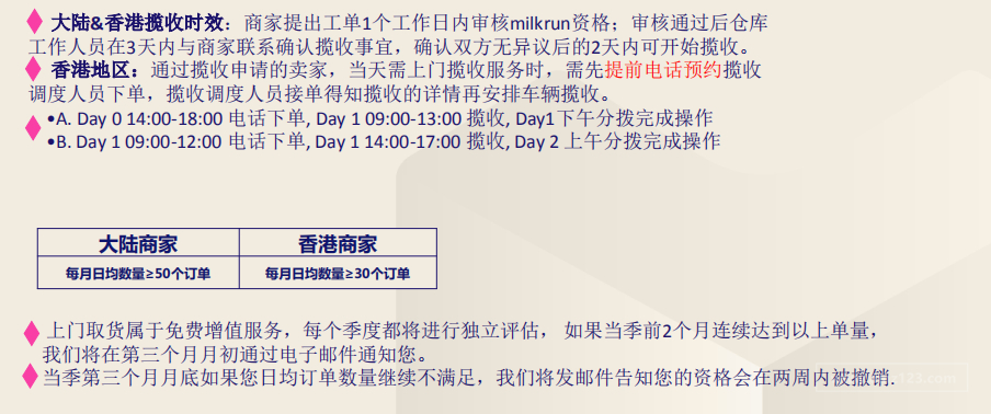 (七)Q: 周六日司机是否可以上门揽收? 答:除香港地区客户,周六下午、周日不安排,其他时间司机都可以揽收,请商家按照司机 约定时间之前准备好货物和交接。
