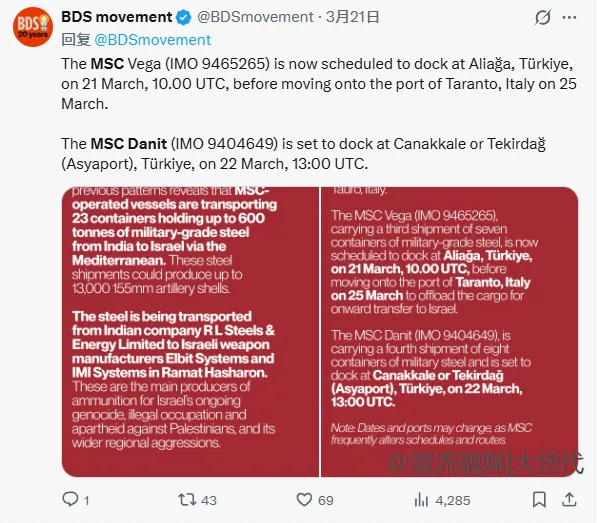 且他们最终还成功促使了意大利对相关货物进行检查——意大利媒体在后续报道中写道“意大利港口当局和码头工人截获了多批运往以色列武器工厂的原材料和精密部件”;BDS运动则发布最新公告称,“运往以色列的4批军用级钢材中有3批在意大利被扣押并接受调查”。