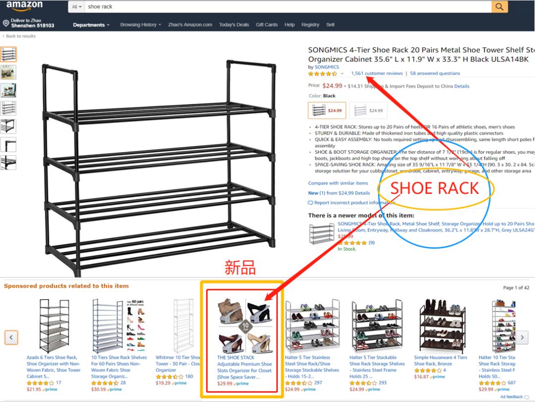 上图所示,鞋架这个产品,关联广告位置出现了一个0 review的新品-鞋托。