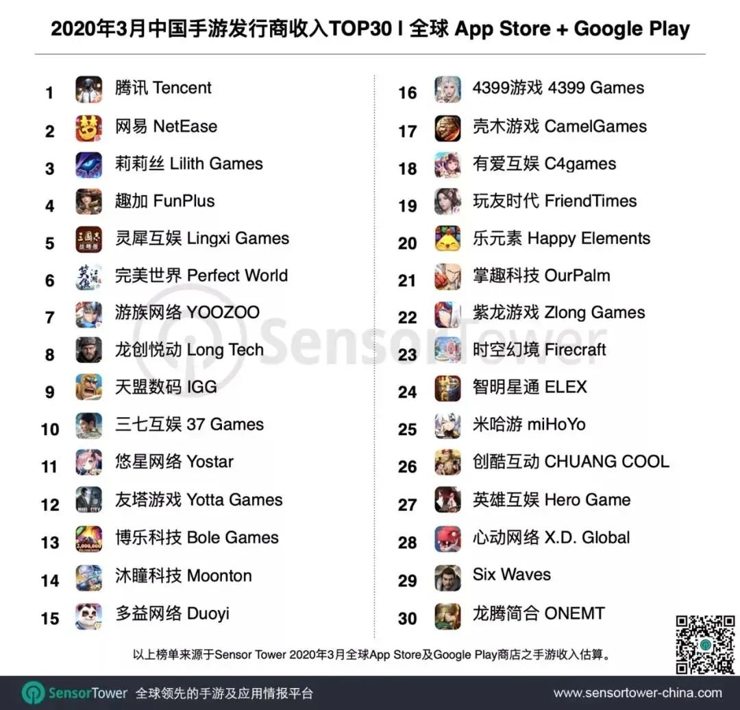 近日,Sensor Tower 发布了 2020 年 3 月中国手游发行商全球 App Store 和 Google Play 收入排行榜,本期榜单的 30 个中国手游发行商在这个月份全球收入超过 16.3 亿美元,占全球总手游收入的 27.6%。