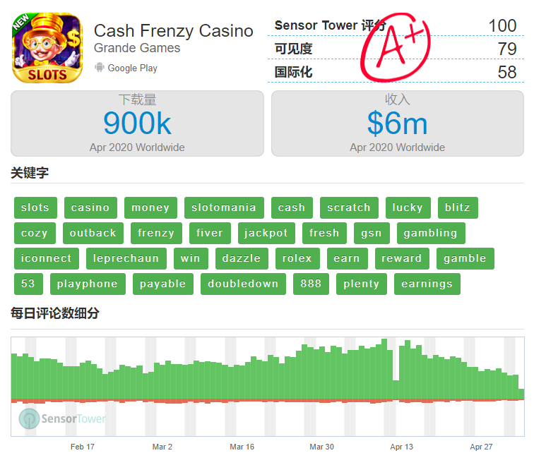 根据第三方数据显示,2020 年 3 月,博乐科技收入预估为 1873 万美元,其中博乐旗下主力产品《Cash Frenzy》预估收入为 1040 万美元。
