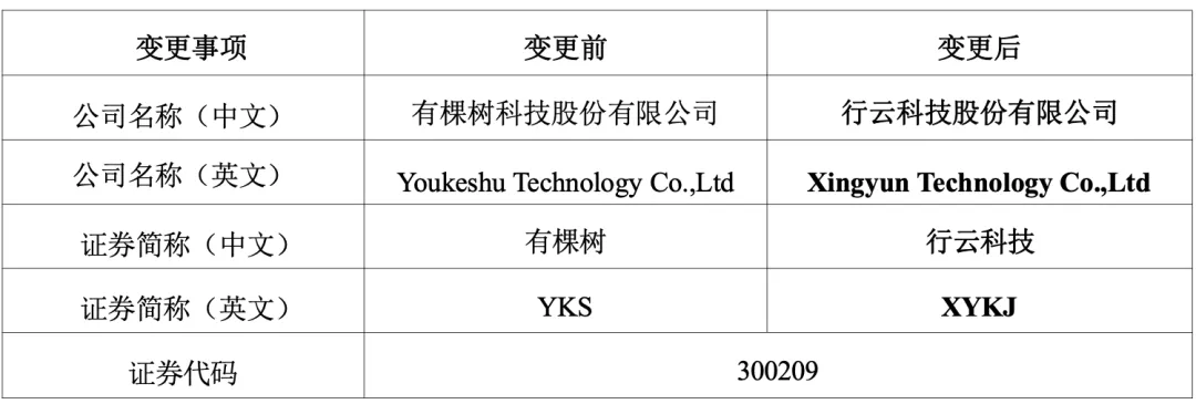 2026年1月27日,上市公司有棵树发布公告称,为了更加全面地体现公司的产业布局和运营情况, 准确反映公司未来战略发展方向,使公司名称与公司定位、战略规划相匹配,突出核心产业投资人深圳市天行云供应链有限公司的企业品牌, 公司拟变更公司名称及证券简称,变更后公司名称为行云科技股份有限公司,变更后公司简称为行云科技,证券代码保持不变。