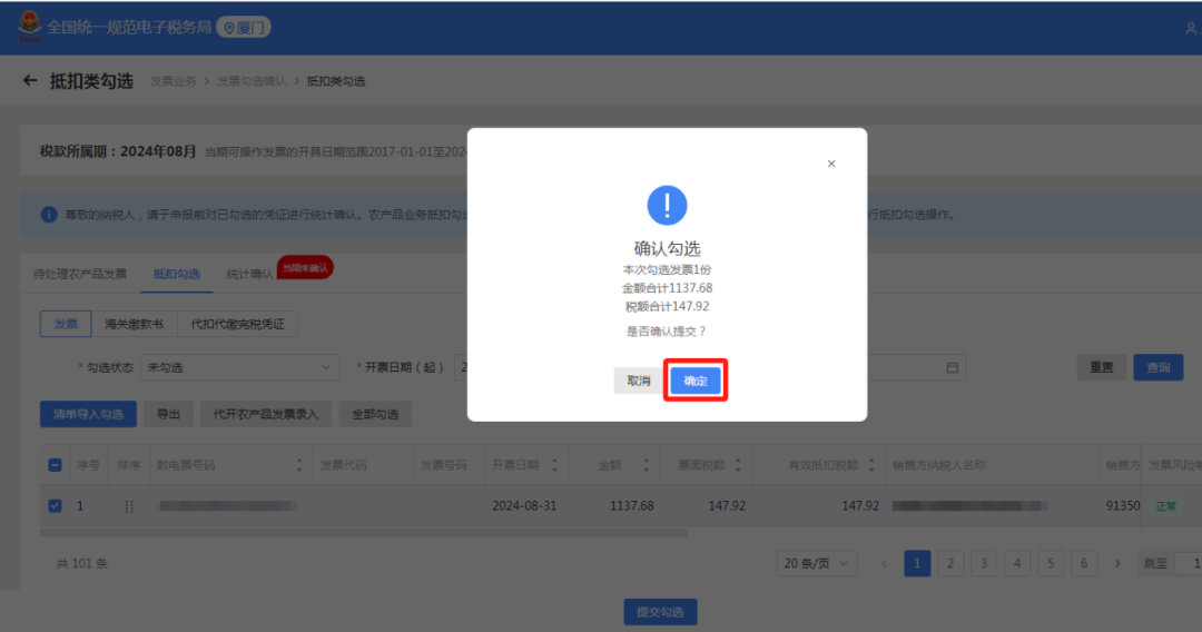 提交完数据后会跳出弹窗,对勾选发票信息进行核对,确认无误后点击“确认”。