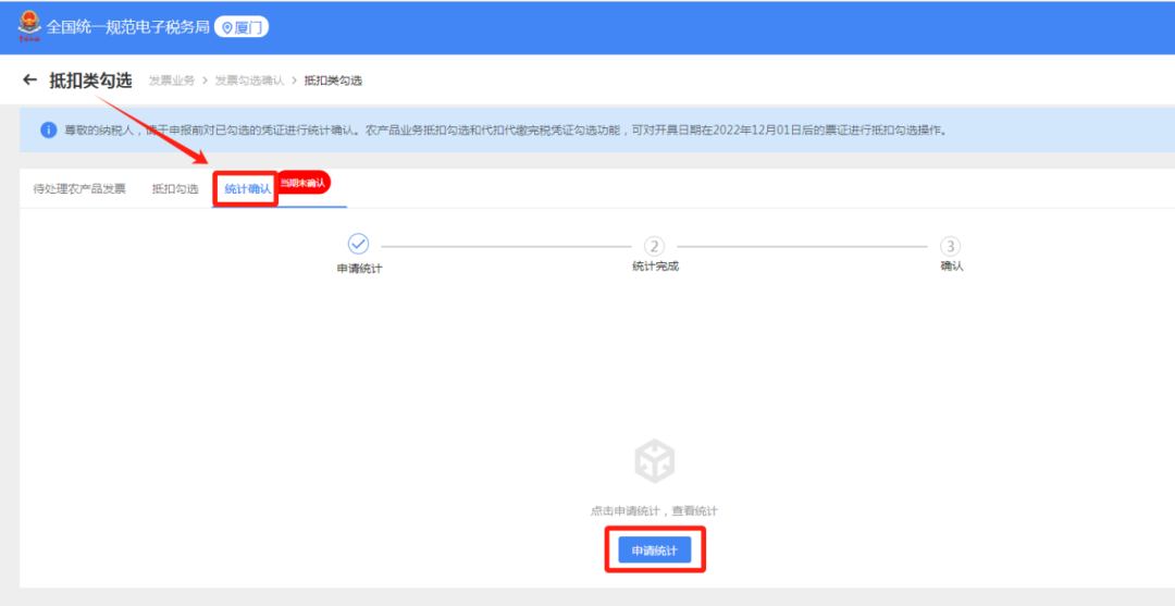提交勾选后,进入“统计确认”模块,点击“申请统计”进行统计。核对统计数据,无误后,对统计表进行确认,点击“统计确认”。