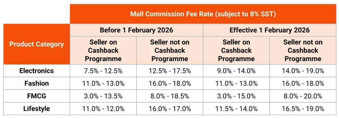 自2026年2月1日起,平台调整返现计划服务费(Shopee Cashback Programme (SCP)),卖家在促销日(包括两位数销售日、月中促销和发薪日促销)期间,需支付 7.5%的服务费(每件商品最高收费 100 令吉)。