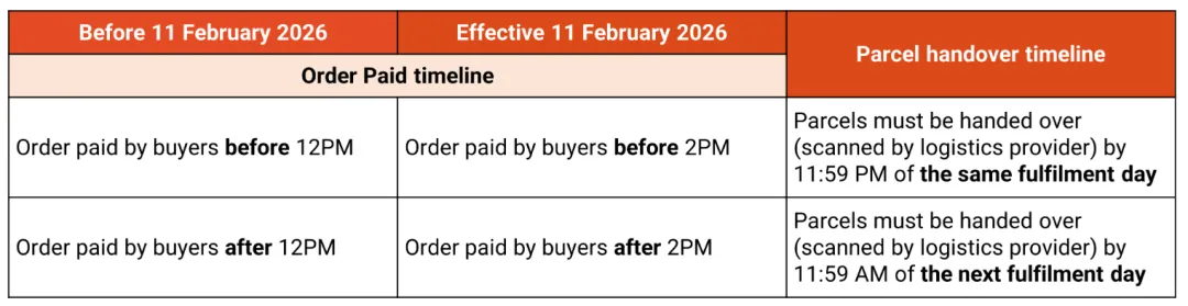 自2026年2月11日起,为了给卖家更多备货、发货的时间,每日截单时间(COT)从中午12:00延长至下午2:00,订单支付截止时间也同步延后到下午2点,交接截止时间的要求则保持不变。