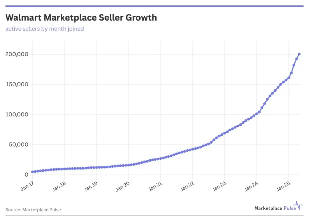 更关键的是,其电商业务持续以超过20%的同比速度高速增长,展现出强大的市场吸引力。而根据行业数据,截至2025年5月,沃尔玛平台的活跃卖家数量已突破20万。虽然卖家生态在快速丰富,但相较于亚马逊数百万卖家的规模,沃尔玛市场依然呈现出 “增长快、竞争缓” 的稀缺格局。