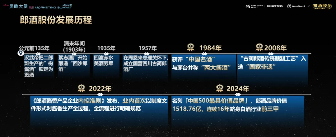 郎酒的酿造历史源远流长,可追溯至汉武帝时期,当时二郎滩的酒便已被作为贡酒。品牌正式的前身始于1903年,至今已逾百年。1984年,在全国评酒会上,郎酒获评“中国名酒”,当时全国仅有两款酱香型白酒获此殊荣,一个是茅台,另一个就是我们。这亦是我们后来提出“青花郎,中国两大酱香白酒之一”定位的历史渊源。至2024年,郎酒品牌价值达1518亿元,连续16年稳居白酒行业品牌价值前三甲。