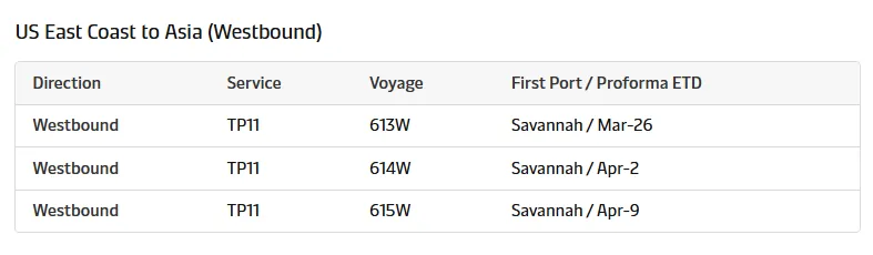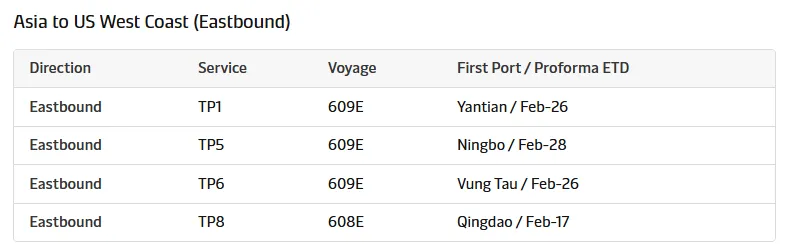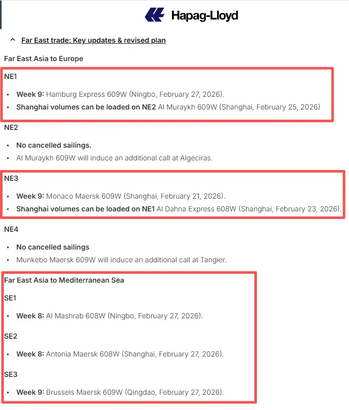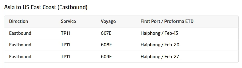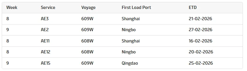 对于美国东海岸,受影响的是US1航线,该航线将在2026年第7、8和9周停靠釜山后结束;以及US2航线,该航线将在第8周停靠萨凡纳并在第10周跳港诺福克。