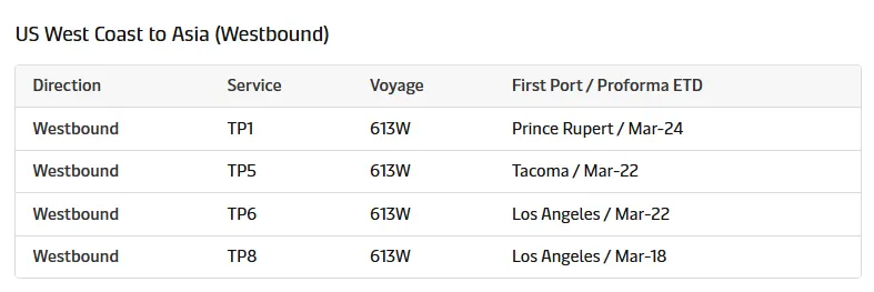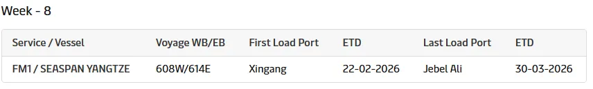 对于西海岸,WC1、WC3和WC4将在第9周停航,而WC2将在第8周停航。亚洲-欧洲航线的停航包括第9周的NE1和NE3,以及第8周将停航的SE1和SE2,SE3则在第9周停航。