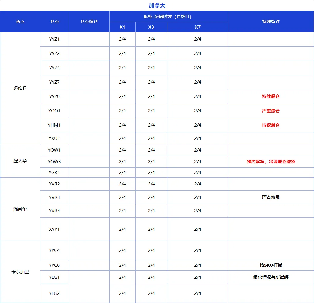 加拿大部分仓库近期情况如下: