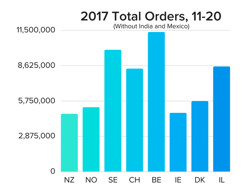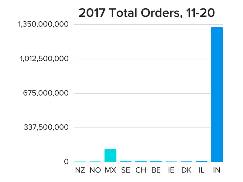 然而,仔细一看,斯堪的那维亚半岛上,坐落在欧洲之巅的3个人口稀少的国家,让人眼前一亮。挪威,瑞典和丹麦的订单排名都在11-20范围内!