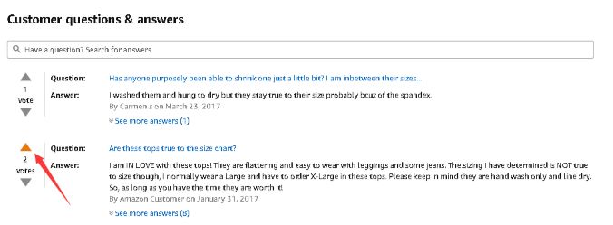 5、 把一两个重要的Q & A帖子置顶、增加帖子热度,这对页面转化率最重要。置顶就是使买家投票最高的帖子第一眼被顾客发现,点击向上箭头投票,如下图: