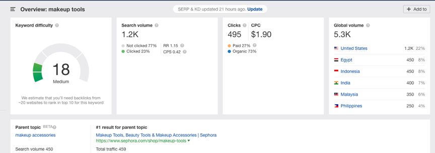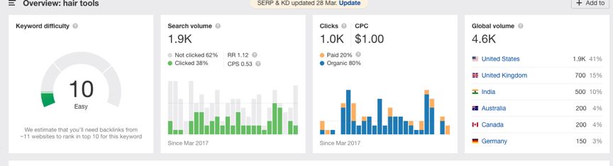 这里以美发类用品这个niche为例。首先对这个niche当中的产品进行关键词分析,其中Makeup tools, Hair tools, Nailtools 这些都属于google搜索量不错,但是竞争比较小的关键词。在做网站内容的时候可以从这几个关键词入手。