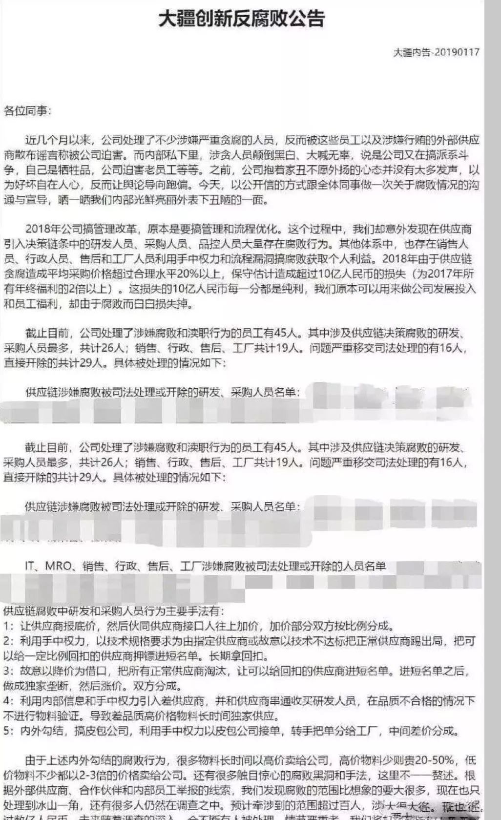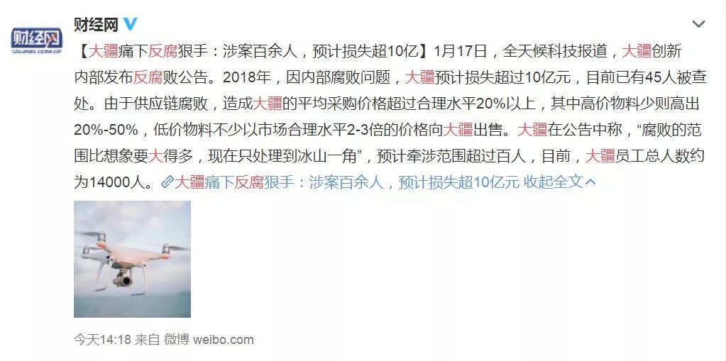 1月17日,大疆内部突然发布一份反腐公告,让我们看到这个被腐败侵蚀得满目苍夷的巨人。