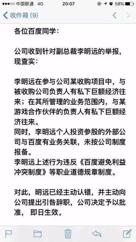 2016年11月,被称为“百度太子”的副总裁李明远被查出与被收购公司负责人,以及某游戏合作伙伴存在巨额经济往来,漩涡之中,李明远引咎辞职。