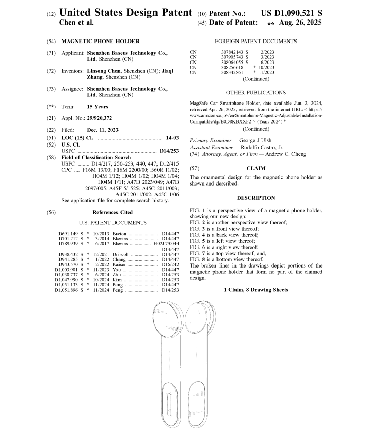 8月26日美国专利局公布一批最新下证美国外观专利,其中包含多款热卖产品,比如全网已售60W+,登顶畅销榜TOP1的磁吸手机支架。