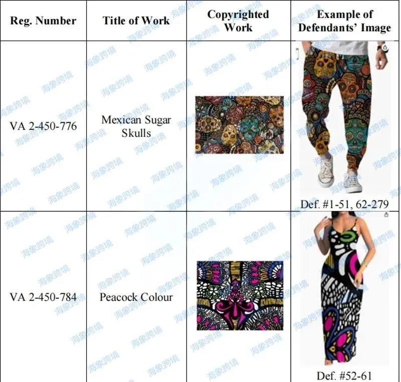原告是一位艺术教师,她于2007年开始出售和展出自己的作品。案件涉及版权图片如下,分别是彩色骷髅插画和非洲风格印花插画,作品风格色彩鲜艳、图案繁复。