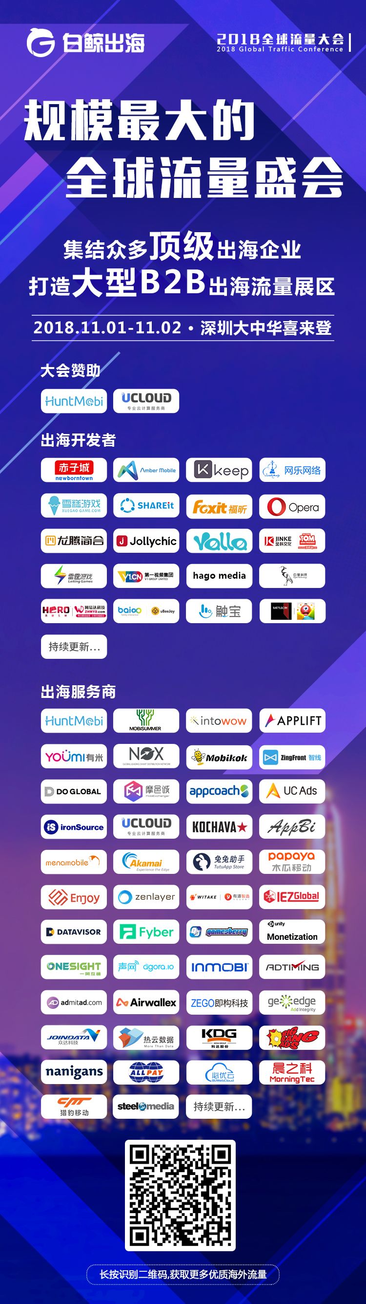 2018全球流量大会(GTC)是国内唯一专注互联网出海国际化展会,由白鲸出海联合百家出海知名企业共同打造的大规模全球流量盛会,大会获得了广东省游戏产业协会和深圳市跨境电子商务协会官方支持。据主办方介绍,届时大会与会者将超5000名。