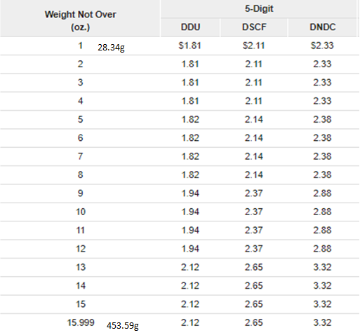 以DDU服务作为示例,在官网公布的价格表上,我们可以看到USPS为该产品按包裹轻重1-16盎司设置了4个价格段:1.81美元 -2.12美元不等