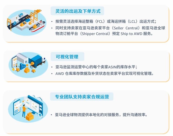 Ship to AWD 是涵盖跨境运输、存储和智能补货到亚马逊运营中心的一站式物流仓储分销解决方案。亚马逊卖家可以通过亚马逊全球物流(AGL)提供的海运整箱(FCL)和海运拼箱(LCL)服务,将库存运送到美国的 AWD 仓库进行存储。由于 AWD 价格包含亚马逊物流入库配置服务费,因此您不会被单独收取亚马逊物流入库配置服务费。