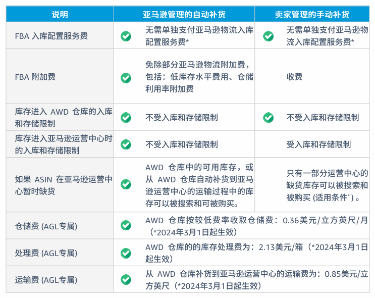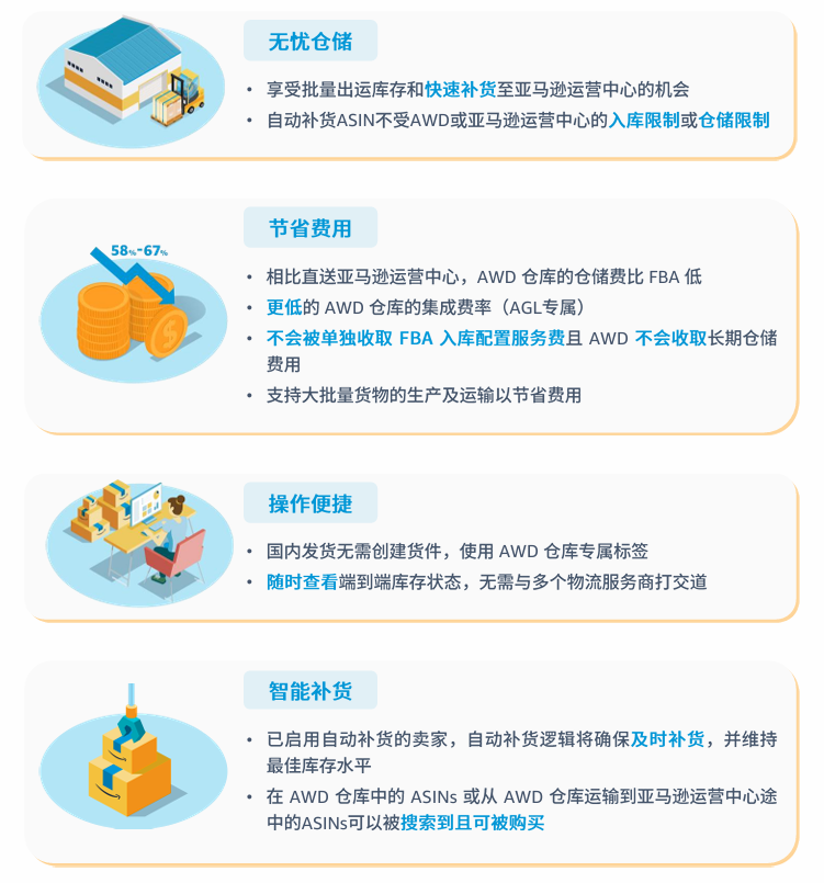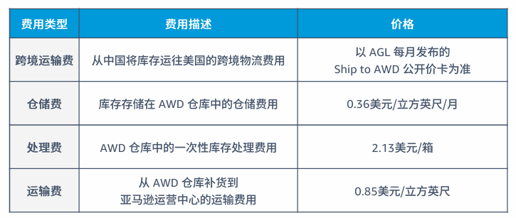 从 AWD 仓库补货到亚马逊运营中心的库存处理费和运输费用具有竞争力。