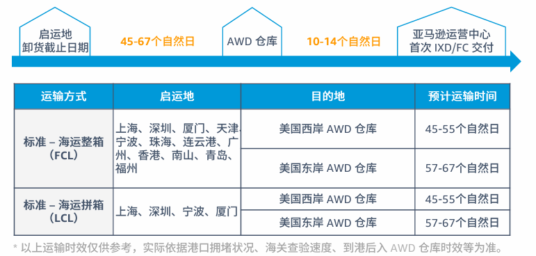 跨境运输时效:标准海运从启运地到美国 AWD 仓库的平均运输时间为45-67个自然日