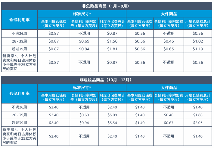 2.新卖家是指向运营中心发送首个货件的时间不超过365天的卖家。如果超过365天,亚马逊将根据此类卖家的仓储利用率向其收取仓储利用率附加费。