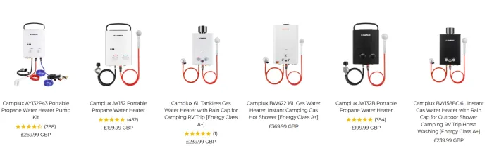 CAMPLUX产品均价在199美元—500美元之间,其在亚马逊欧美站销量极佳,其首款户外热水器抢占BSR榜单前五。