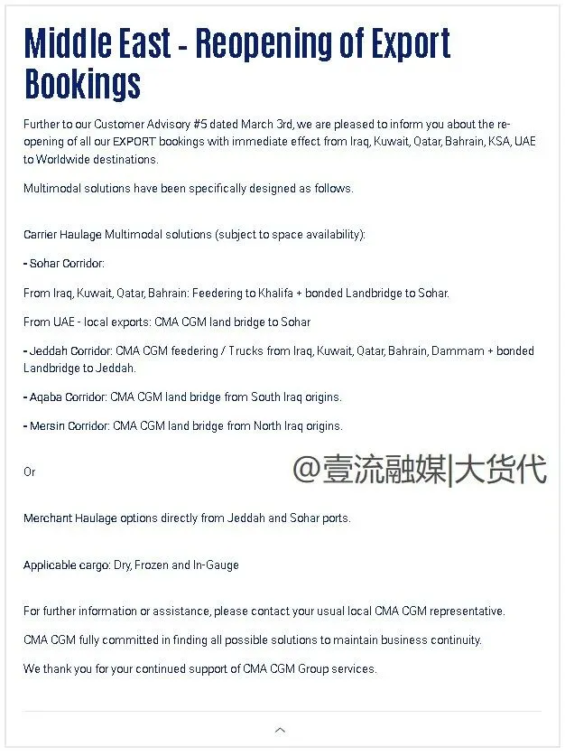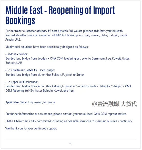 法国班轮运输巨头达飞海运(CMA CGM)也在3月11号宣布,重新开放中东地区的进口货运预订!