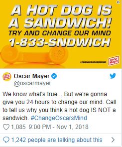 三明治零售商Oscar Mayer则在三明治日发起了#ChangeOsacarsMind的话题讨论,谈论“热狗到底是不是三明治”的争议性话题。