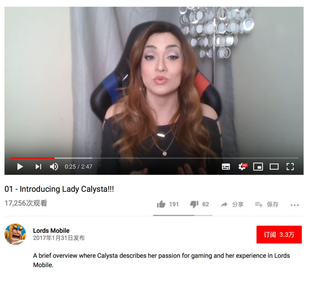 《王国纪元》就和美女游戏玩家Lady Calysta合作,推出了一系列游戏推广的视频。Lady Calysta一边玩游戏一边和粉丝聊天,每个视频的时间长度都不超过10分钟,但是吸引了很多人的观看。视频点击率最高可以达到1.7万次。