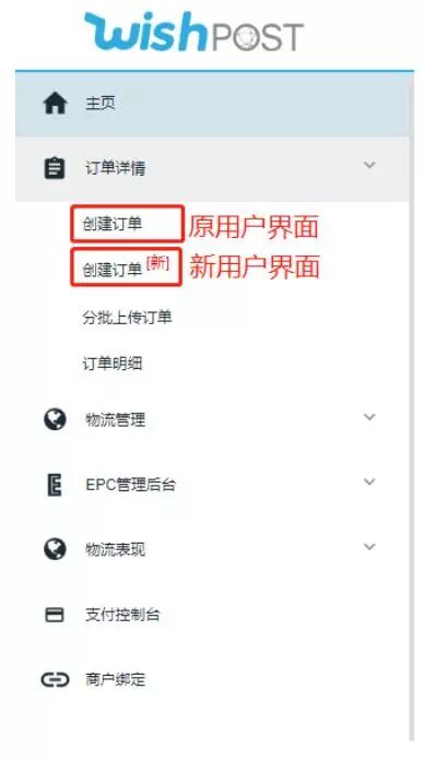 登陆Wishpost界面,点击菜单的”创建订单”或“创建订单【新】”均可申请物流运单;