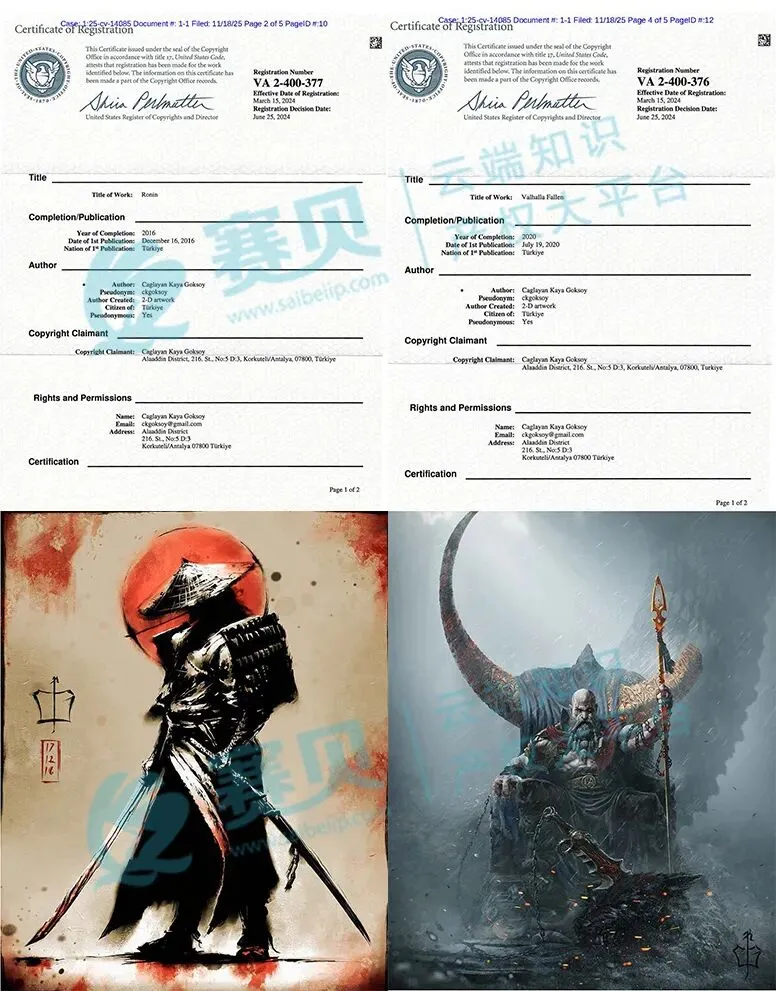 【25-cv-14085】战神角色+武士剪影2幅热门作品加入维权,Caglayan Kaya Goksoy发起版权TRO!