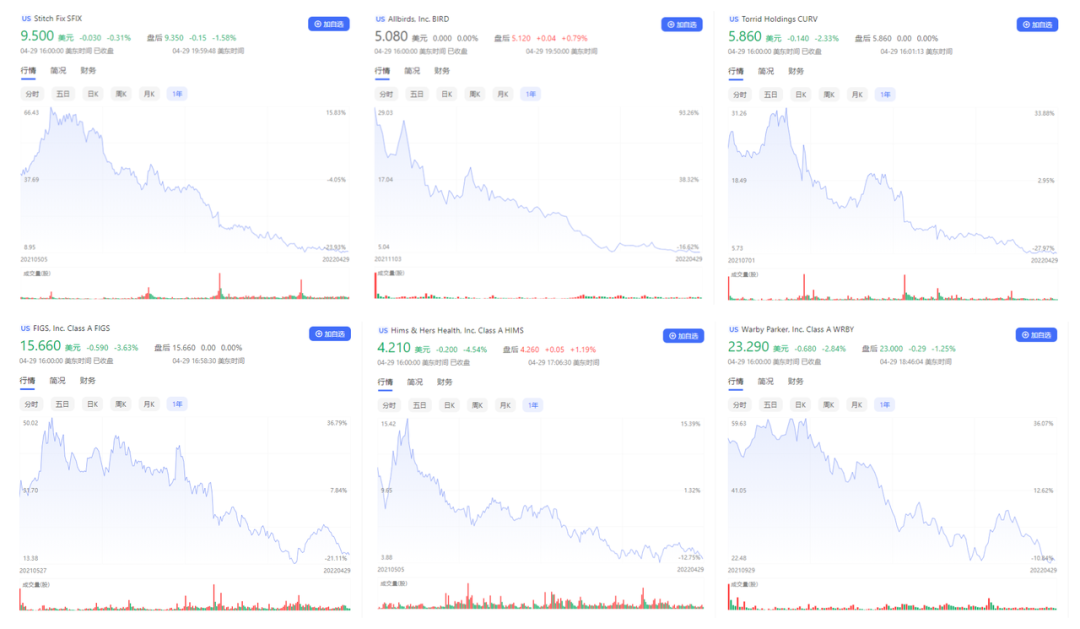 Stich Fix股价从去年6月的66美元下降到今年4月底的9.5美元,跌幅达85.6%,市值蒸发了60亿美元;Allbirds从去年上市后的29美元下降到今年4月底的5美元,跌幅近83%,市值减少至不到10亿美元;Torrid从去年峰值的31美元下降至今年4月底的5.9美元,跌幅约78%,市值已低于7亿美元;FIGS从去年峰值的50美元下降至今年3月初的13美元,跌幅约74%,市值缩水近57亿美元;Hims & Her从去年峰值的15美元下跌72%至今年4月底的4.2美元,市值仅剩8.6亿美元;Warby Parker从去年峰值的60美元下跌62%至今年4月底的23美元,市值减少42亿美元……
