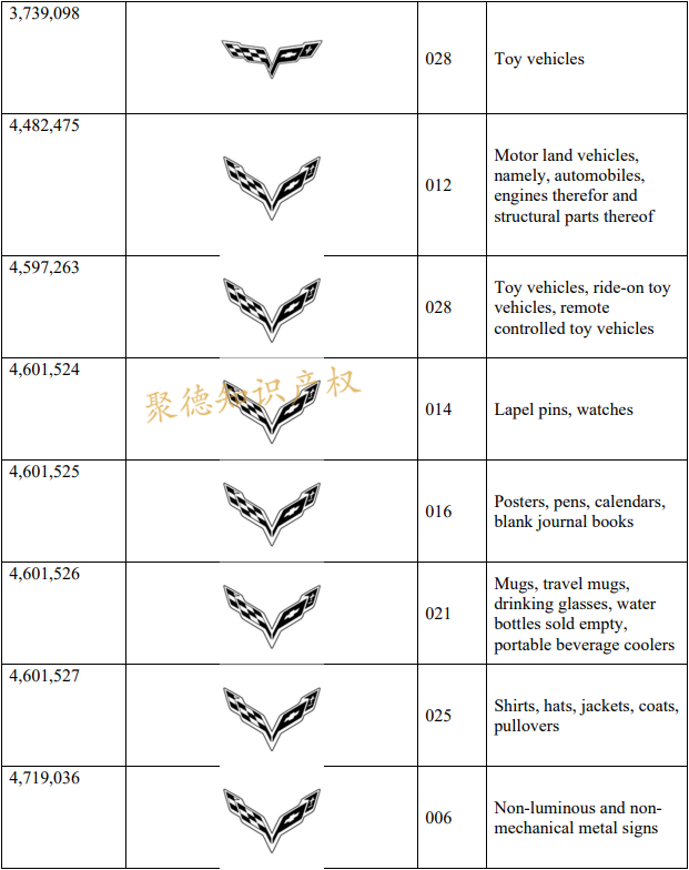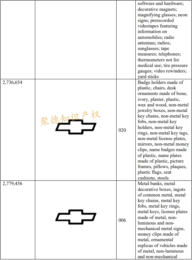 经过精心的策划和监督,消费者认识到通用汽车及雪佛兰品牌是可靠和高质量的汽车、汽车零部件和配件、微型汽车和玩具,以及各种其他生活产品。通用汽车已经在美国注册了774件商标,以下是案件的部分维权商标。