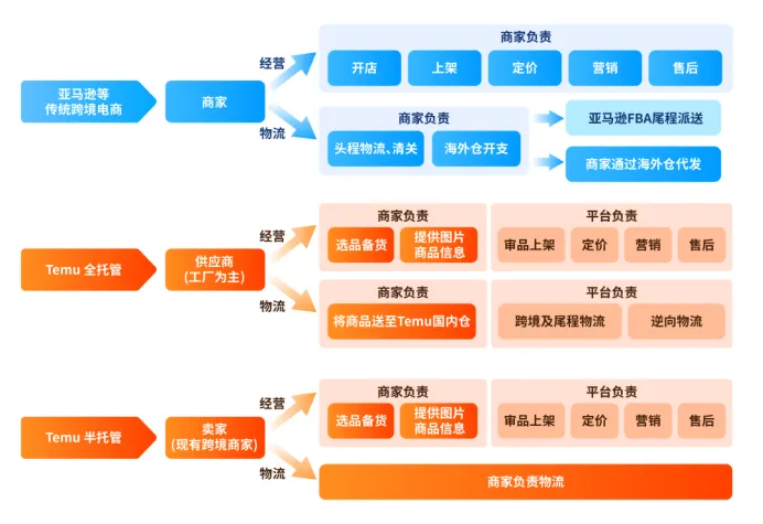 它既有全寄售(Temu定价),又有半托管(卖家管理库存)。随着美国关税政策(de minimis)的变化,从中国直邮的小包模式正被迫向本地履约转型。
