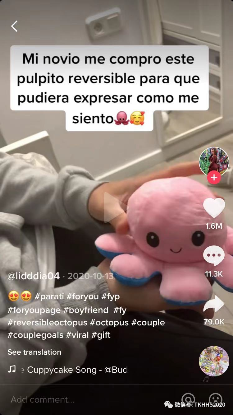 TikTok2月份的爆款双面章鱼reversibleoctopus,朔源这款产品我们发现在2020年10月13日Lidia发布了这款产品的视频获得了930万的播放,160万的点赞;