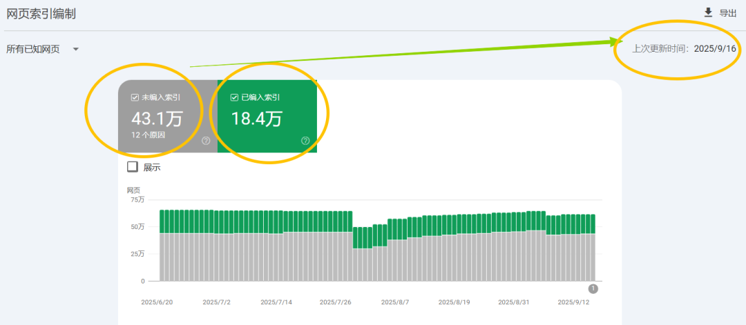 截图一下2025年9月18日的疯狂写文章的网站的收录,62万的页面数量,够多了吧,收录只有18.4万,看下面流量单日点击最高的时候也才200点击每天。