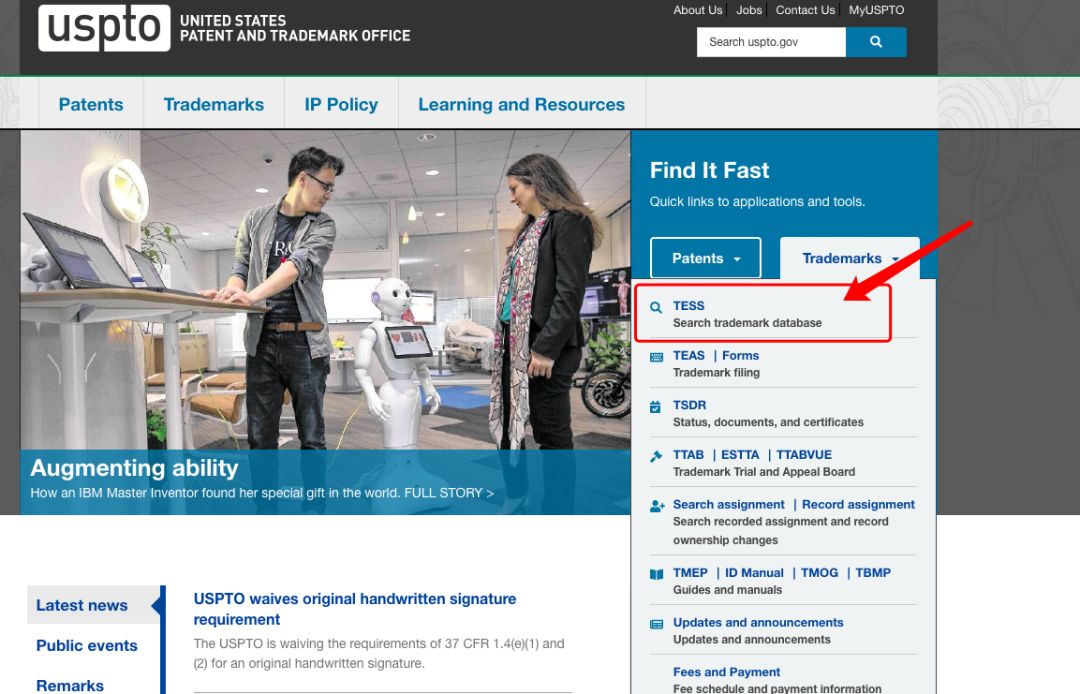第一步:打开美国商标专利局网站,点击红色图标按键,如下图
