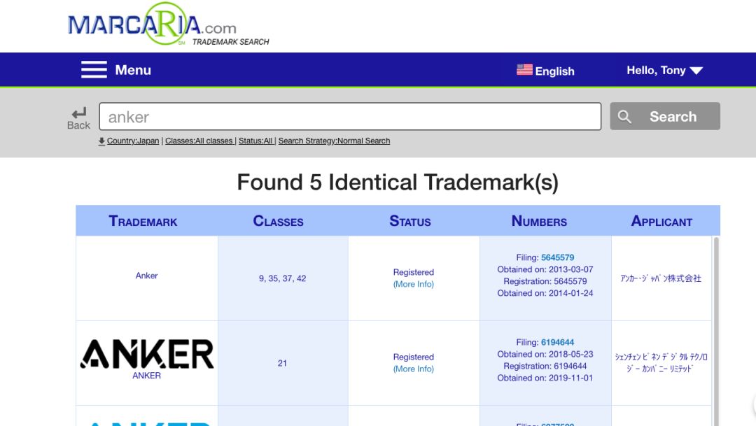 第四步:输入商标名称,比如ANKER,然后查询,如下图