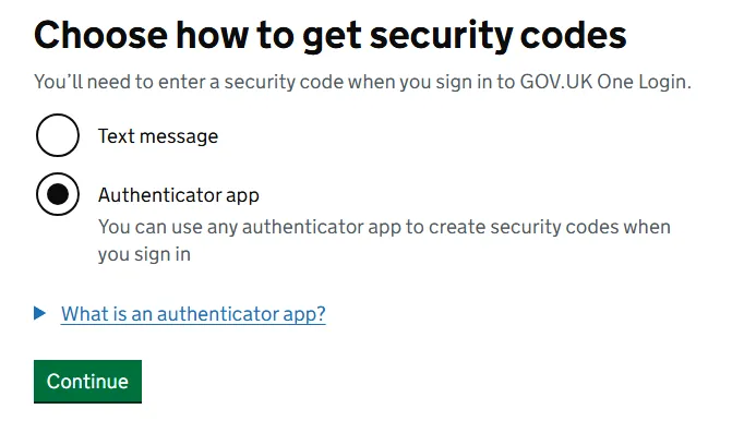 9、选择验证方式:1. 短信验证(只能是英国手机号码);2. Authenticator APP验证。选择第二个,点击 Continue(继续)。