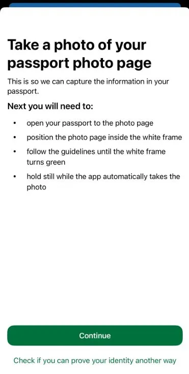 24、开始扫描护照人像页,避免在白色背景前扫描,会导致无法识别,扫描完成后点击 Continue(继续)。