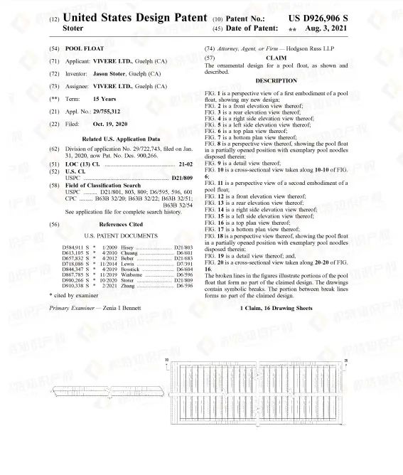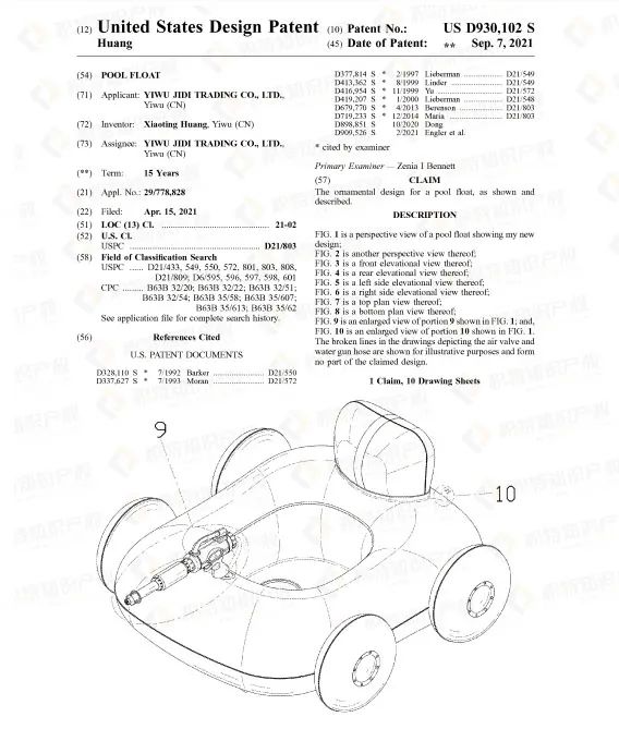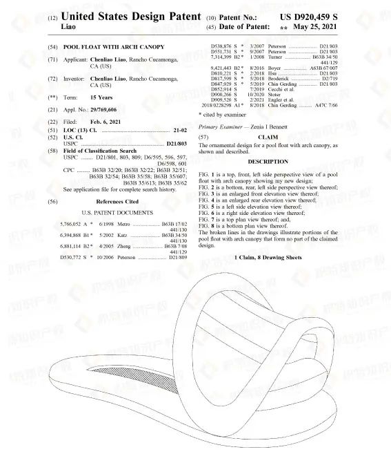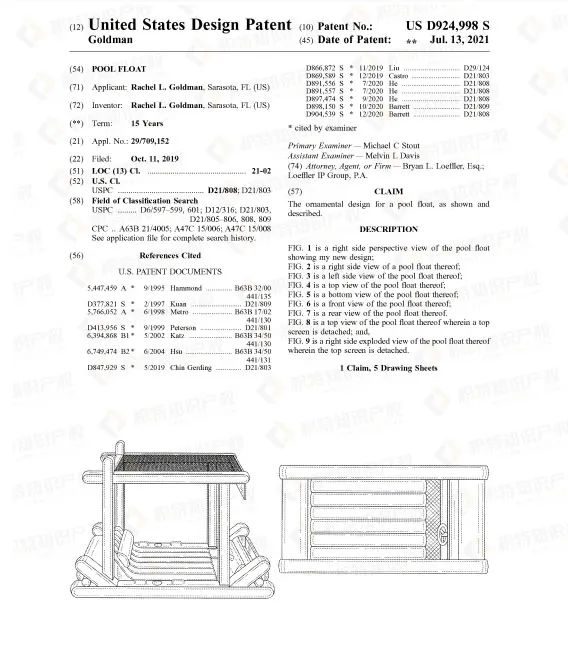 水上浮垫外观各异,这就意味着它的外观专利侵权风险不会少。果不其然,检索发现大量美国外观专利,卖家上架此类产品前一定要注意避雷。