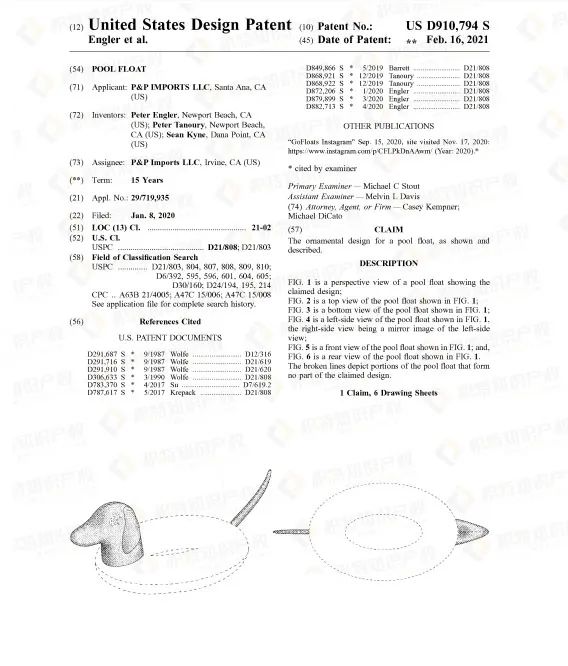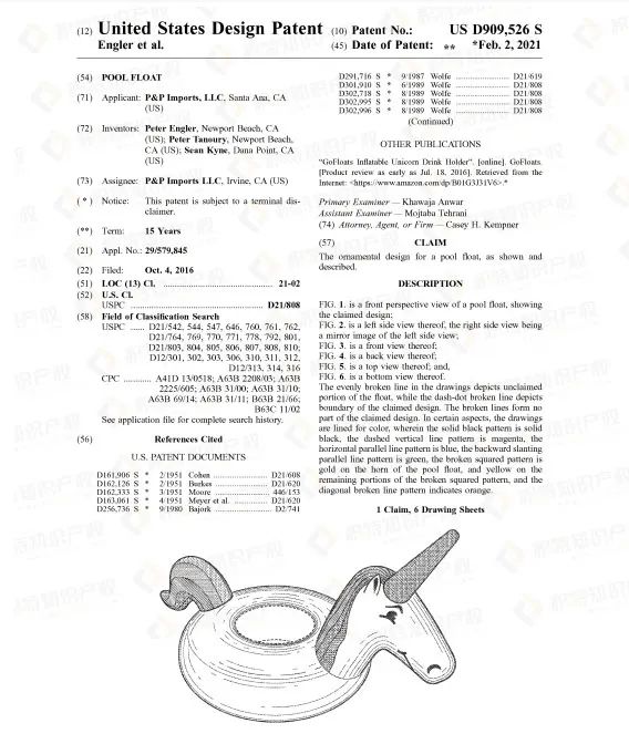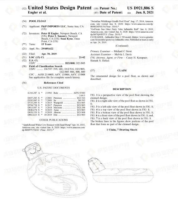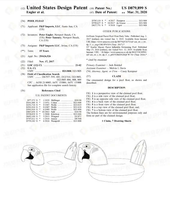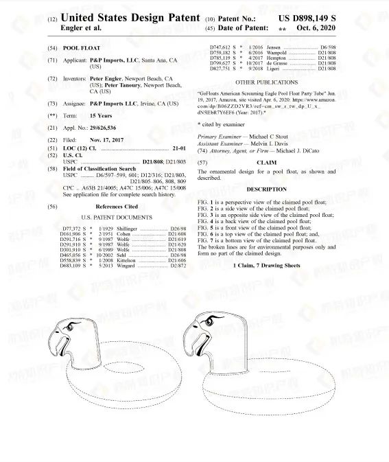 沙滩和泳池是欧美人的夏日最爱,适合这两个场合使用的水上浮垫向来都是“抢手货”。聪明的卖家不仅能抓住爆单机遇,还早早就进行了专利布局。例如以下这款Amazon’s Choice产品,今年1月份就已获得美国外观专利授权: