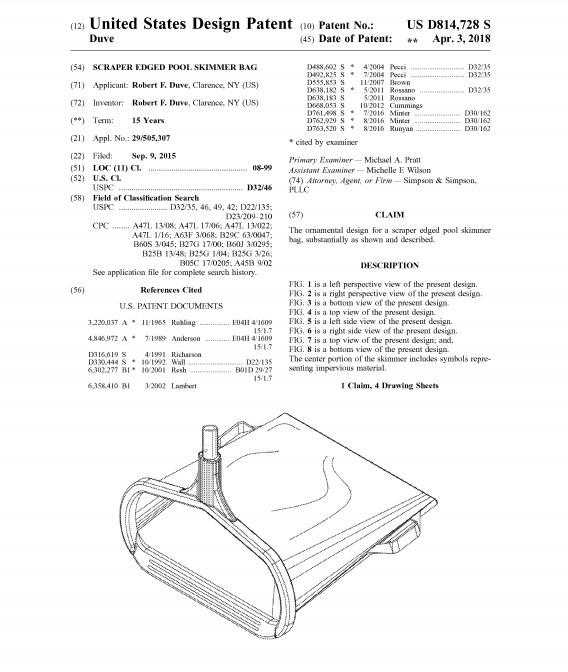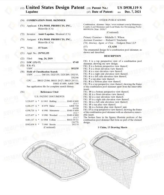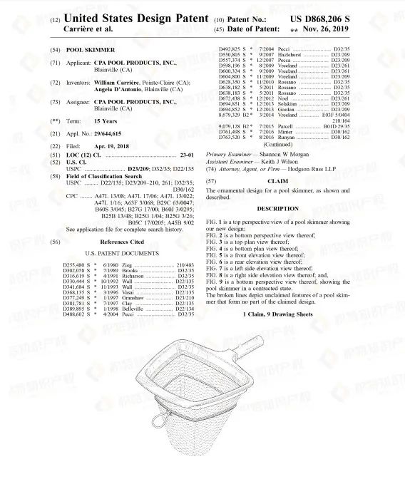令人意想不到的是,看似平平无奇的泳池撇渣器竟也有外观专利,有打算卖这类产品的卖家要小心: