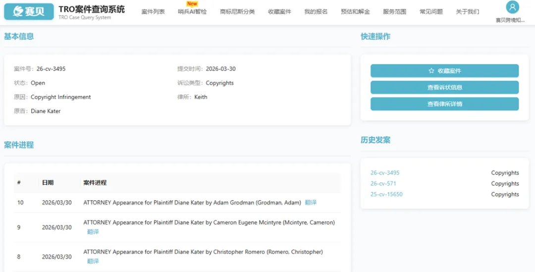 从赛贝TRO案件查询系统获悉,本案原告为美国知名平面设计师Diane Kater,由Keith A. Vogt PLLC律所代理,诉讼类型为版权侵权,依据《美国版权法》起诉;